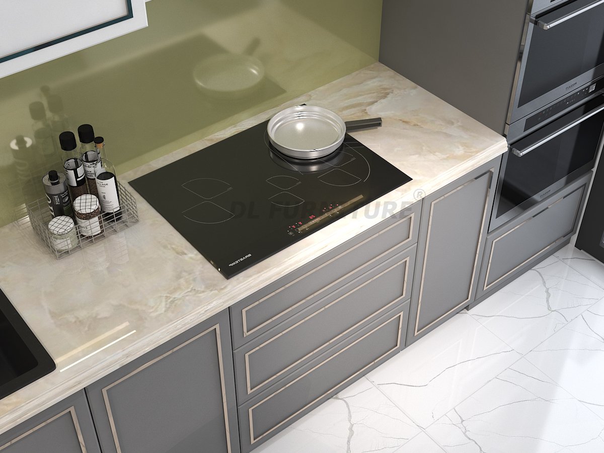 Mặt bếp được lát đá cẩm thạch có độ thẩm mỹ cao, làm bừng sáng cả căn bếp, đồng thời rất bền chắc và dễ dàng vệ sinh khiến gian bếp luôn sáng bóng, sạch sẽ. Vách tường cũng được ốp kính để có thể lau chùi vệ sinh đơn giản và nhanh chóng, ngoài ra còn giúp tạo cảm giác rộng rãi, dễ chịu.