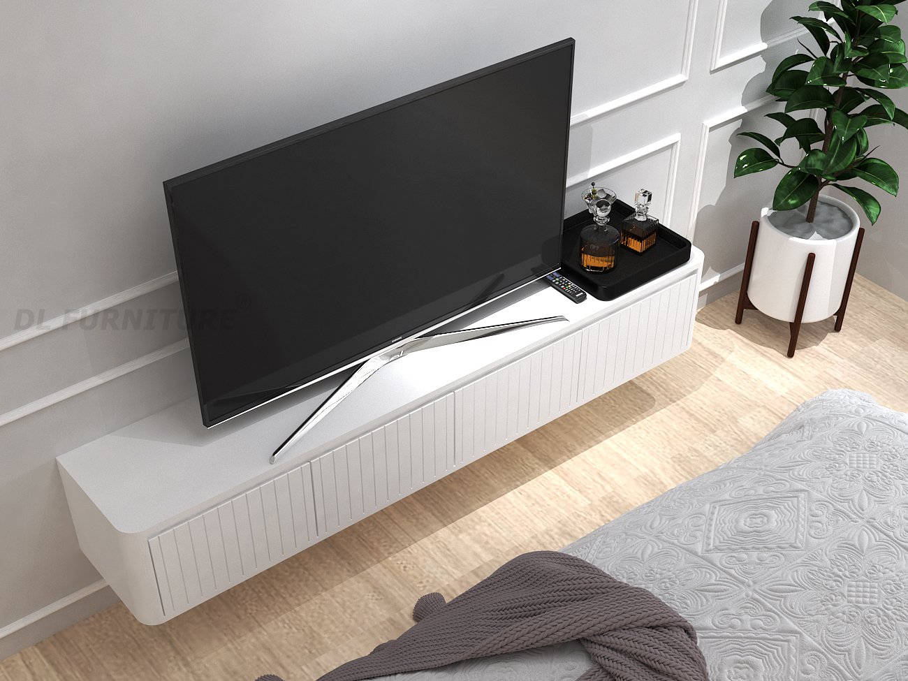 Kệ ti vi được thiết kế tối giản, loại bỏ những chi tiết rườm rà là chân và tay nắm cửa, trông thẩm mỹ và hiện đại hơn mà vẫn phát huy tối ưu công năng. Không chỉ là kệ tivi, đây còn là một tủ đựng đồ với rất nhiều ngăn hộc, rất tiện lợi.