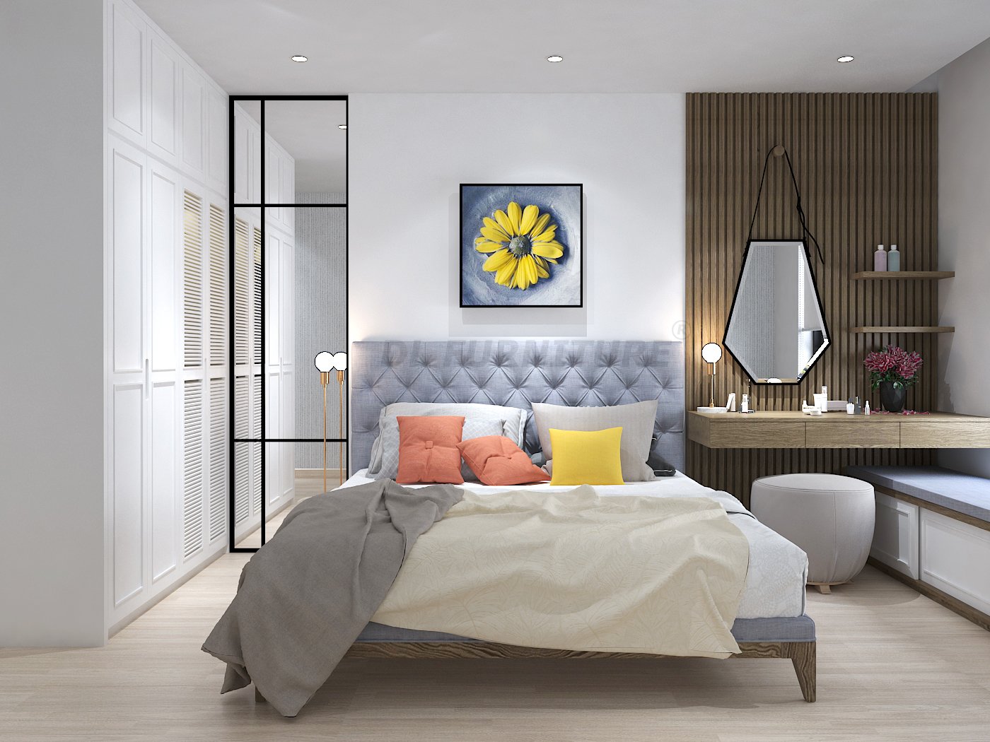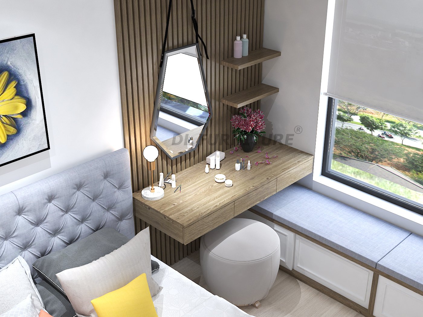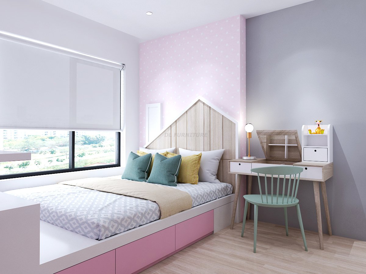 Giường ngủ kết hợp với ngăn tủ kéo để tăng công năng, bàn học vừa có thể biến đổi thành bàn trang điểm, đó chính là những thiết kế thông minh mà NTK của DL FURNITURE® dành riêng cho không gian phòng ngủ có diện tích khiêm tốn. Vừa tạo điểm nhấn vừa tối ưu không gian.