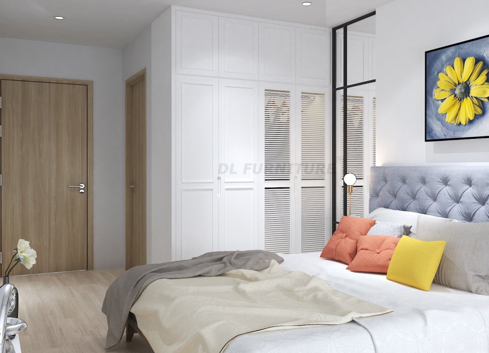 Tủ quần áo lớn được đặt ngay bên trái giường ngủ rất thuận tiện, với tông trắng hòa hợp với màu sắc nhã nhặn của tổng thế, đồng thời góp phần giúp căn phòng ngủ trông sáng và thoáng hơn.