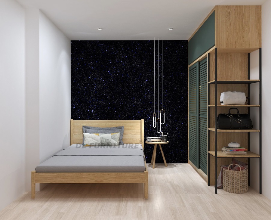 Không gian thư giãn, đọc sách lí tưởng được NTK DL FURNITURE® thiết kế riêng cho chủ nhân căn phòng với background là khung cảnh bầu trời đêm, bàn trà nhỏ đặt ngay cạnh giường ngủ, đèn ngủ thả dài với ánh sáng dìu dịu. Đây quả thực là một không gian thư thái để nghỉ ngơi sau một ngày học tập căng thẳng.