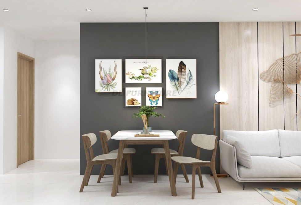 Phòng bếp được nối thông với phòng khách tạo ra không gian mở thông thoáng, giúp tối ưu hóa diện tích. Không gian được thiết kế ấn tượng với màu sắc tương phản từ bức tường đến bộ bàn ăn, cùng với đó là những bức tranh trang trí về tự nhiên bắt mắt khiến cho căn phòng trở nên sinh động và dễ chịu hơn.