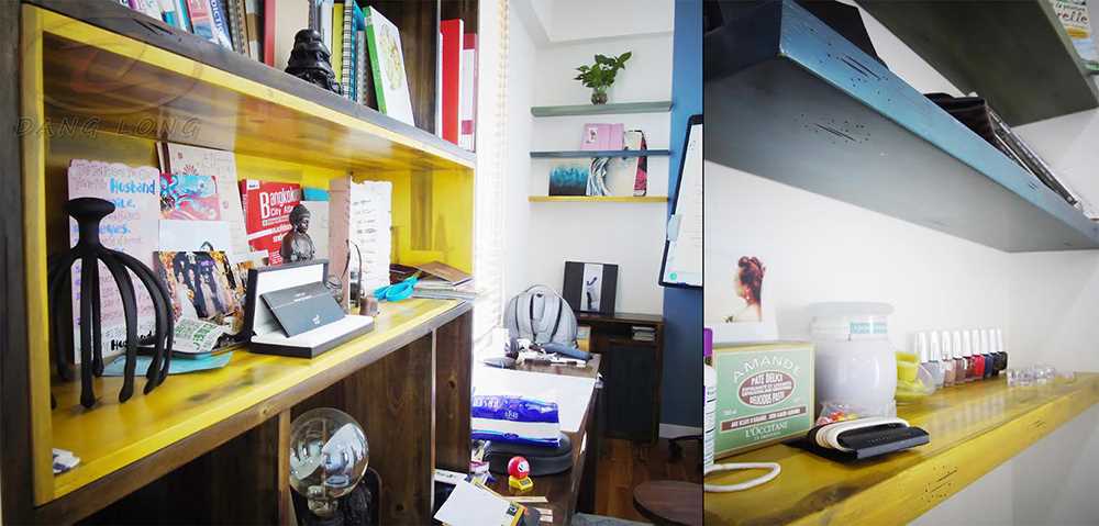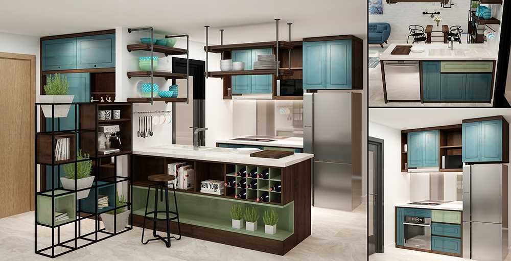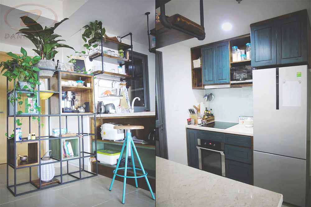 Tủ bếp được có thiết kế liền khối, nhiều giá để vật dụng giống như một quầy bar. Với sự kết hợp giữa sắt và gỗ sẽ làm cho căn bếp trở nên nhẹ nhàng và hìa hòa hơn. Màu sắc của căn bếp này rất độc đáo, kết hợp giữa 4 màu sắc: màu xánh lá, xanh dương, màu nâu và màu trắng tạo cho không gian phòng bếp trở nên sống động hơn hẵn. Điểm nhấn của căn bếp này chính là quầy bếp đảo với nhiều chức năng để sách báo kết hợp kệ rượu.