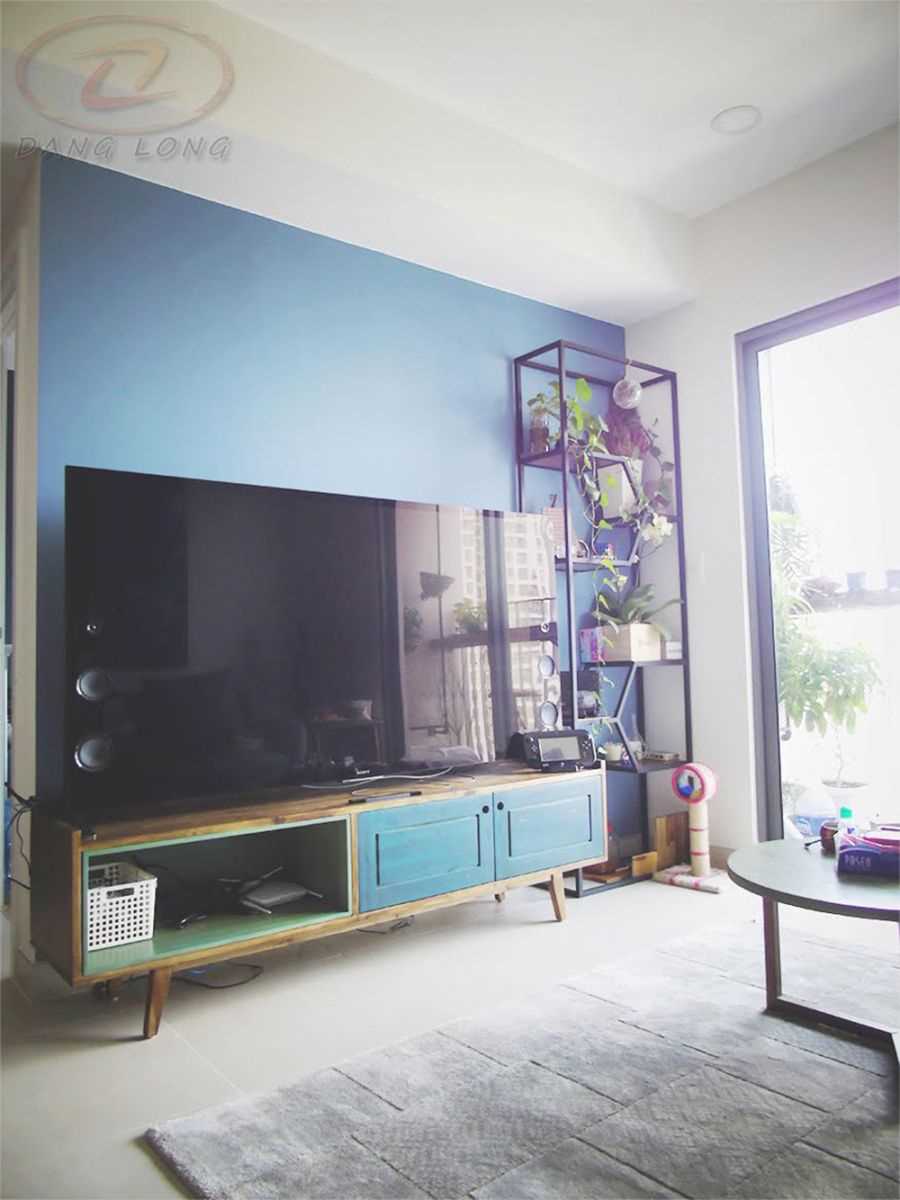 Việc đặt một bộ sofa vải ngay tại vị trí trung tâm của phòng khách với tông màu xanh dương sẫm này sẽ khiến cho căn phòng trở nên hài hòa và mát mẻ hơn nhiều. Bên cạnh đó, gia chủ đã phối những chiếc rèm cùng tông màu với bộ sofa và kệ tivi, tạo nên một bố cục hài hòa và bắt mắt.