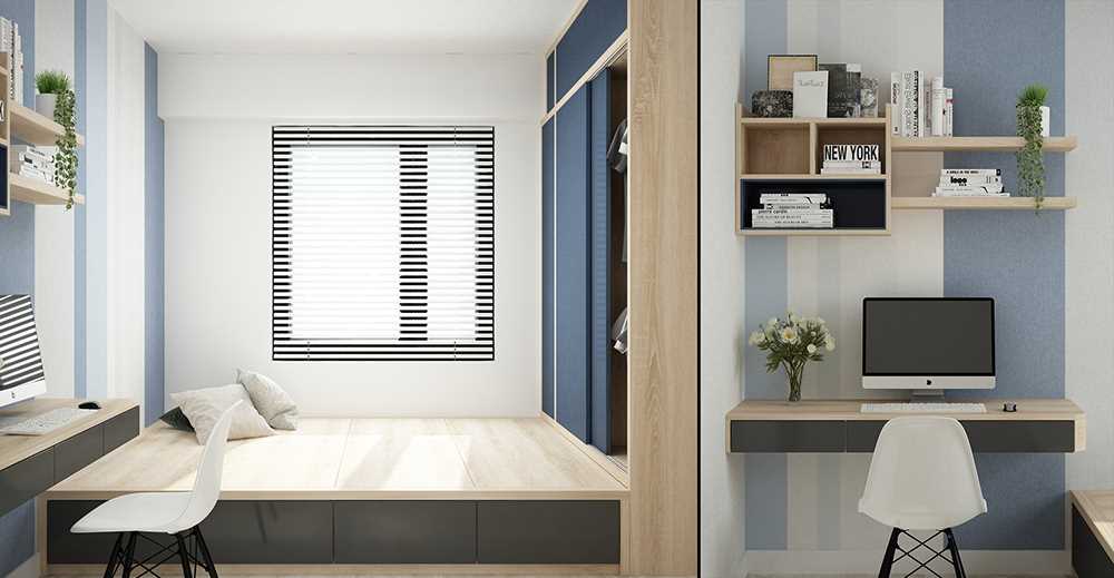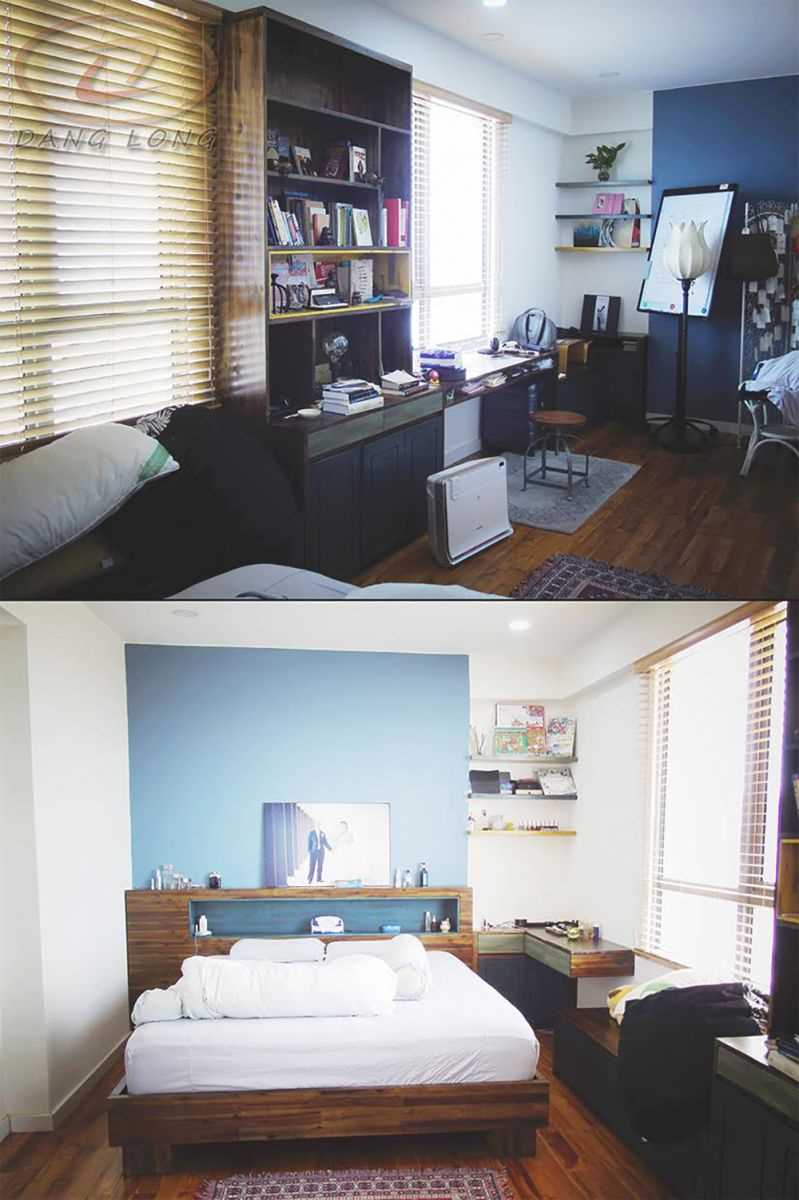 Giường được thiết kế dạng hộp không có đầu giường và có hộc kéo ở bên hông thuận tiện cho việc để đồ. Phần đầu giường được thay bằng giấy dán tường tạo không gian mở cho không gian phòng ngủ. hài hòa và thoáng đãng hơn.