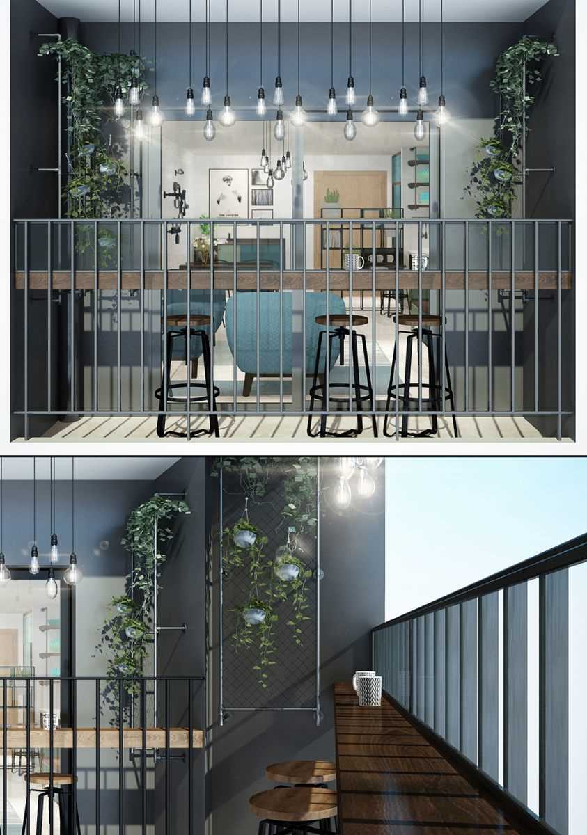 Ban công chính là nơi các thành viên trong gia đình quây quần bên nhau và cùng nói chuyện tâm sự, tận hưởng khi trời mát mẻ mỗi ngày. Với thiết kế bàn bar treo tường này sẽ giúp cho bạn tận dụng được tối đa khoảng diện tích của ban công. Góc thư giãn của gia chủ sẽ trở nên xanh mát và bắt mắt hơn bằng cách treo các chậu cây cảnh trên tường.