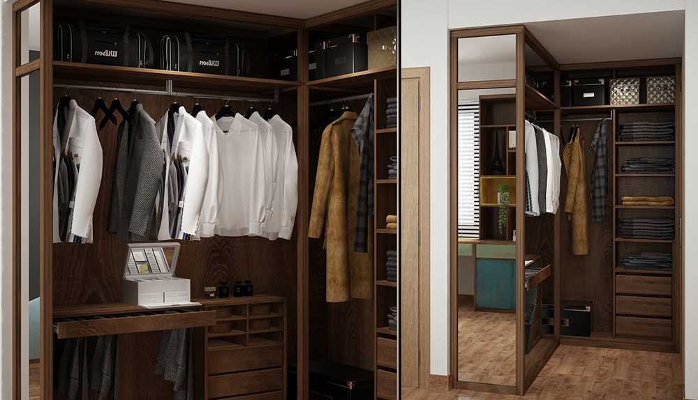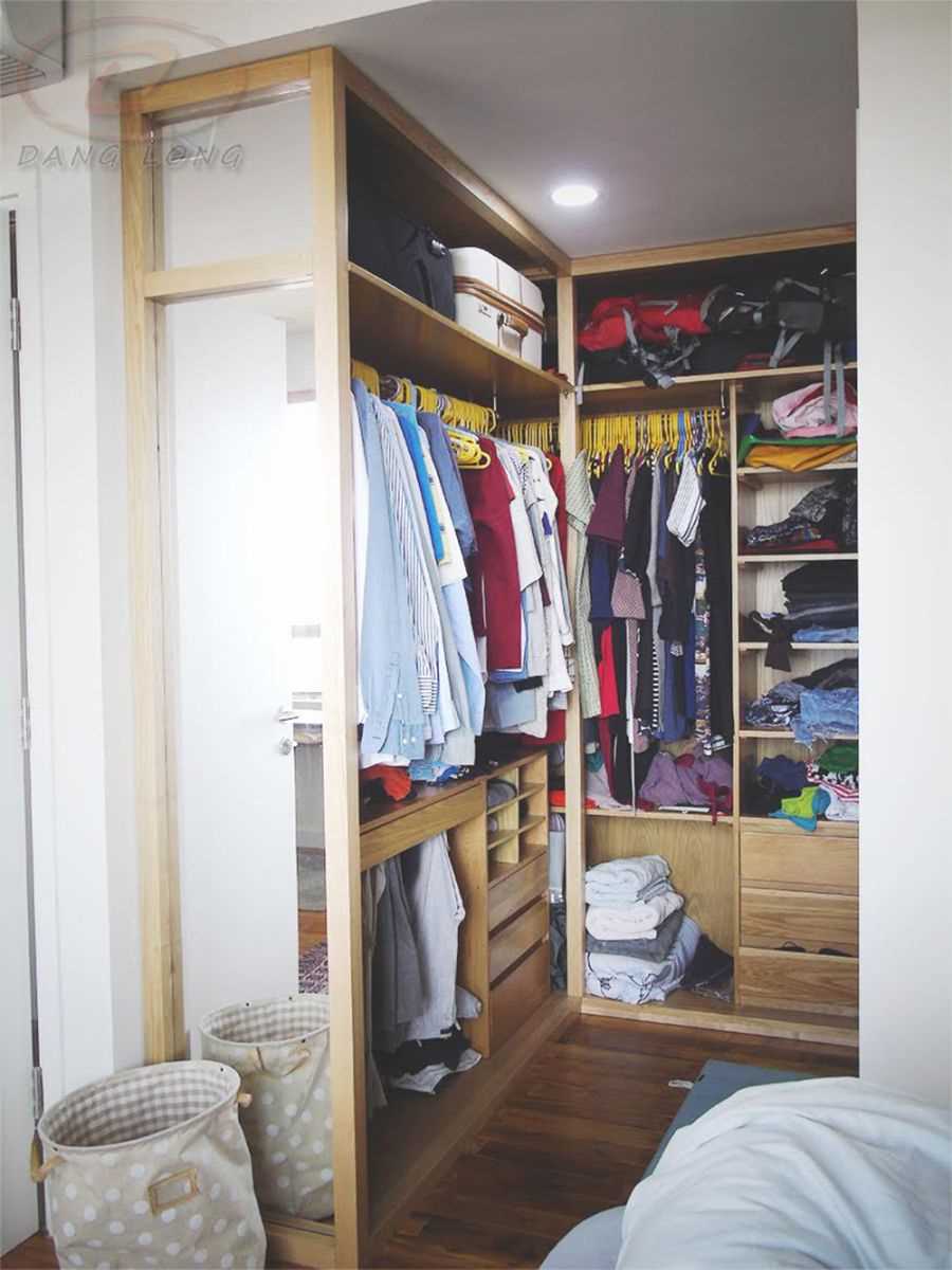Tủ quân áo được thiết kế dạng như những chiếc tủ đặt ở phòng thay đồ. Tủ có dạng mở, không có cánh kết hợp cùng các thanh treo và các ngăn kéo được bố trí vào bên trong, thuận tiên cho gia chủ để áo quần, vali, và các dụng cụ cần thiết đồng thời làm tăng thêm diện tích để đồ. Điểm nổi bật của chiếc tủ này là có gắn thêm phần gương ở bên hông tủ, vừa bắt mắt mà lại tiết kiệm được không gian.