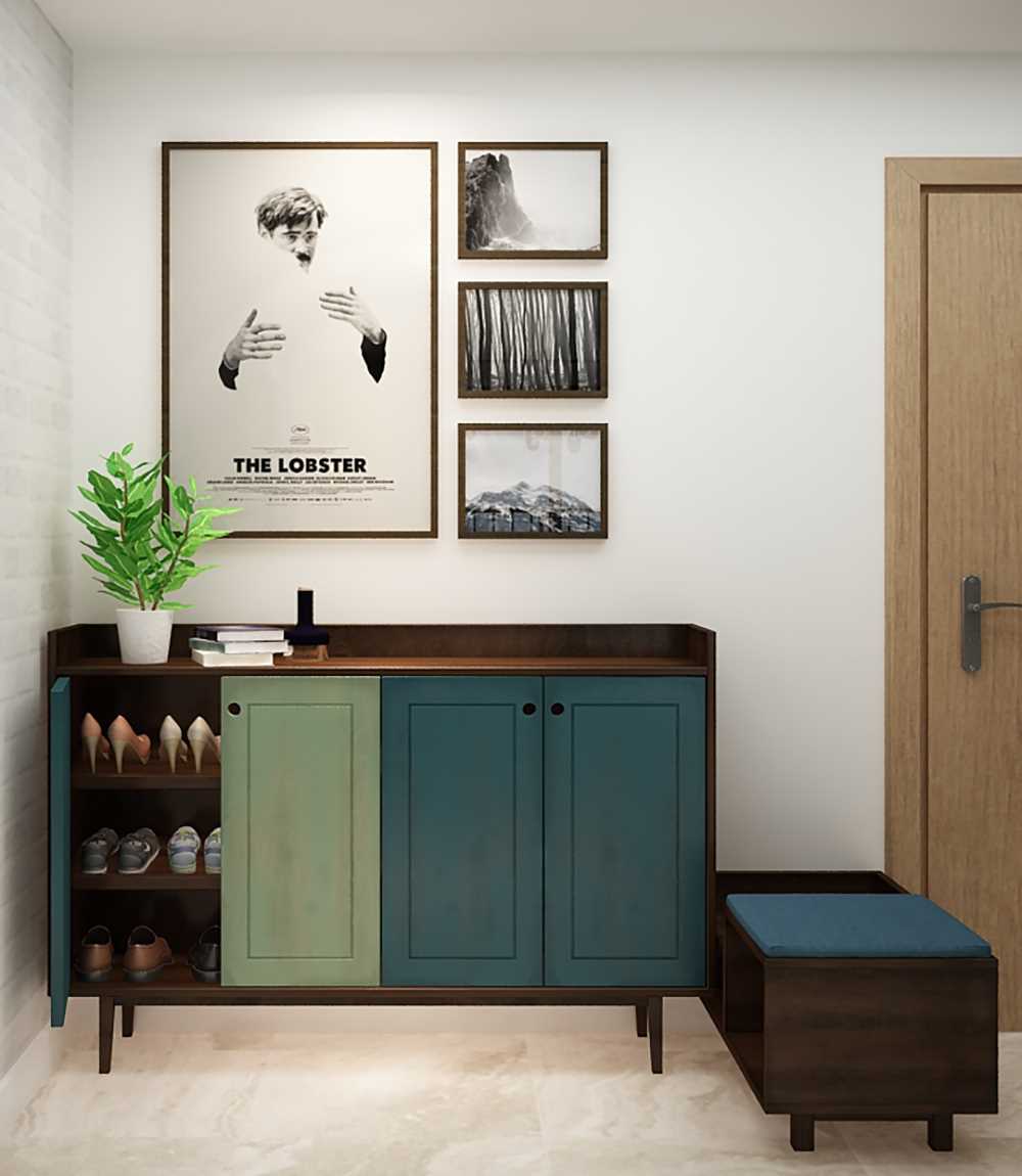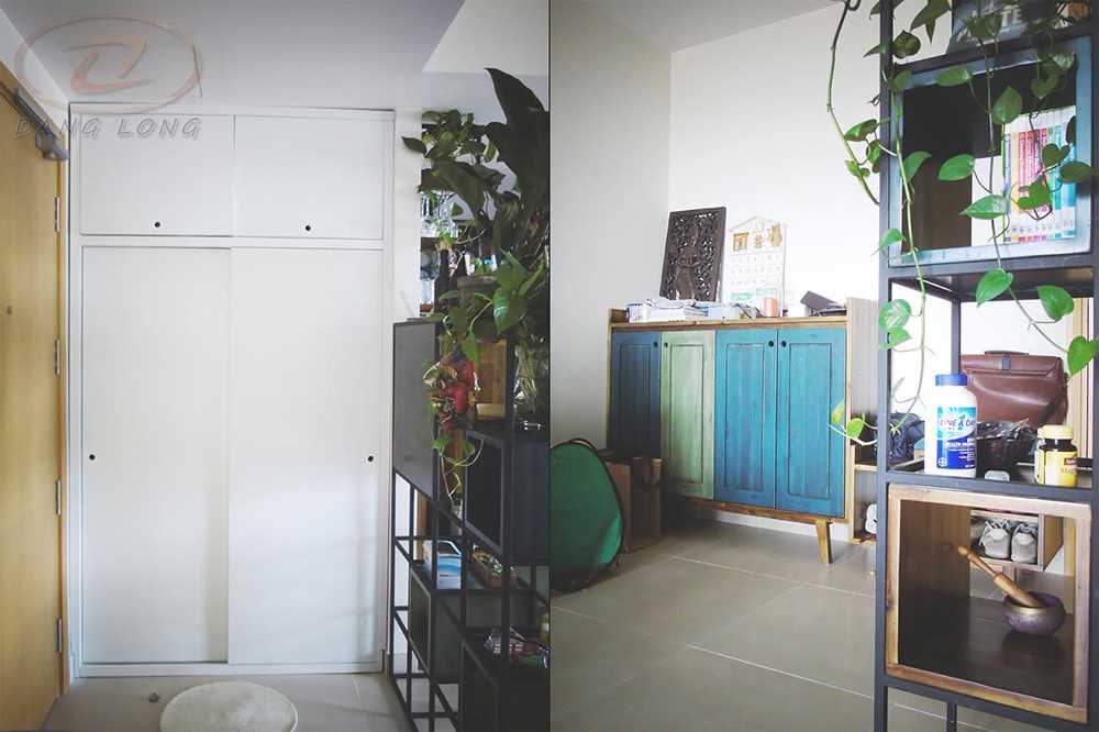 Chiếc tủ giày với phần cánh được sơn màu xanh dương kết hợp màu xanh lá đan xen nhau. Các tấm tầng được bố trí khéo léo ở bên trong chia thành 3 ngăn, mỗi ngăn để được tầm 3 đôi giày, dép.