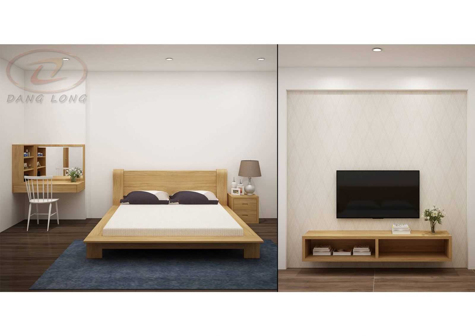 Không gian phòng ngủ của bố mẹ được bố trí khá gọn gàng với một chiếc giường, 1 bàn trang điểm, 1 tủ đầu giường và 1 chiếc tủ quần áo. Giường ngủ làm từ chất liệu gỗ sồi tự nhiên với thiết kế theo phong cách hiện đại. Các mép giường được nâng cao hơn bề mặt giường giúp cho đệm không bị trôi, trượt.