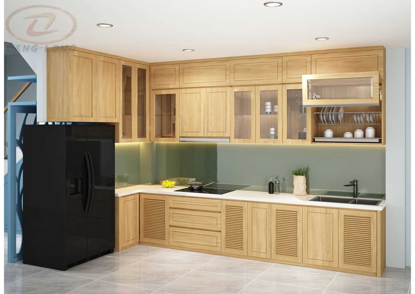Một gian bếp được làm hoàn toàn từ chất liệu gỗ tự nhiên sẽ mang đến cho gia chủ cảm giác yên tâm và thoải mái khi sử dụng. Với phần bếp trên, gia chủ đã lựa chọn việc kết hợp cánh cửa tủ gỗ và phần kính với mục đích vừa có thể để các vật dụng nhà bếp vừa có thể tận dụng phần kính để trưng bày ly, tách hoặc rượu quý. Đặc biệt, phần bếp dưới được thiết kế với những cánh cửa tủ lá xách tạo độ thông thoáng cho căn bếp của gia chủ.