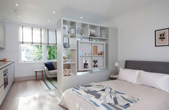 Chủ nhân của ngôi nhà này đã mua một tủ sách để ngăn cách không gian phòng ngủ tạo cảm giác riêng tư hơn.
